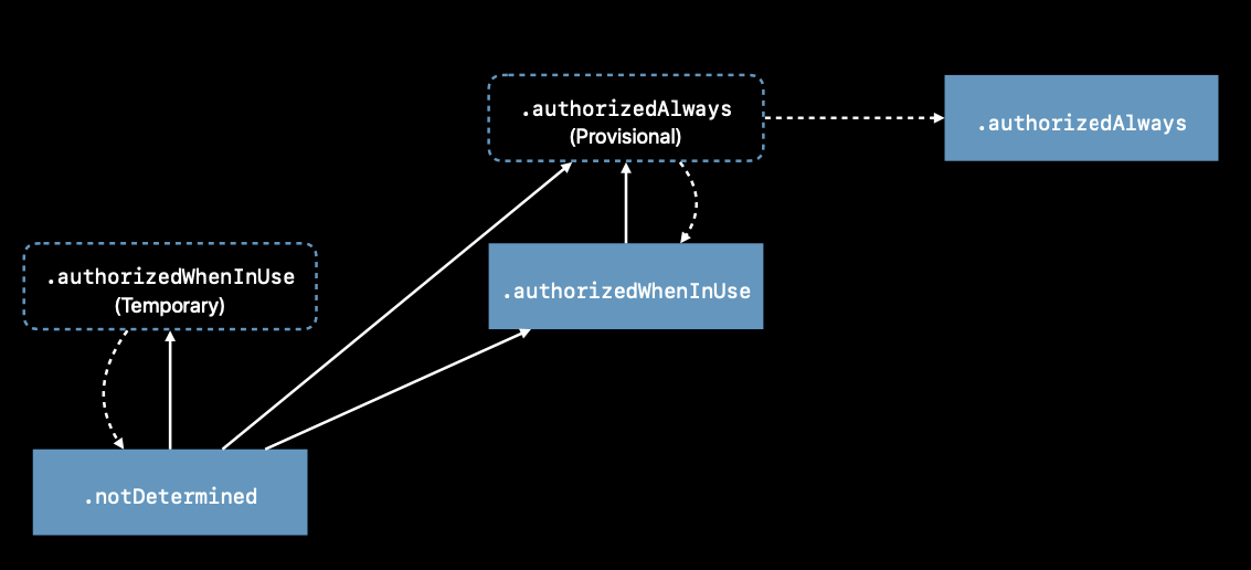iOS 13에서는 위치정보 요청이 복잡하게 변경되었습니다. 이번 포스트에는 "항상 허용"의 변화에 대해서 살펴보겠습니다. 시작 앱의 위치 정보 권한을 상태를 나타내는 enum CLAuthorizationStatus 에는 다섯 가지..