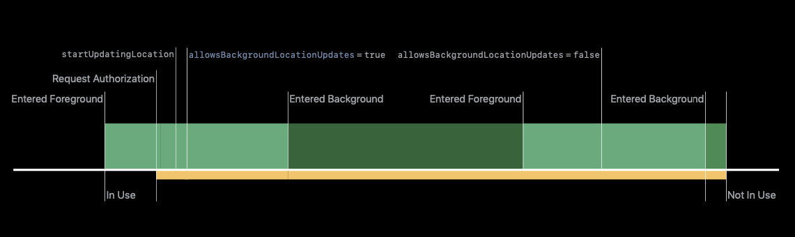 3. 앱이 백그라운드로 돌아가고, allowsBackgroundLocationUpdates = true 로 주어서 백그라운드에서도 지속적으로 위치 정보를 갱신받으며, 다시 앱이 포그라운드로 복귀할 때