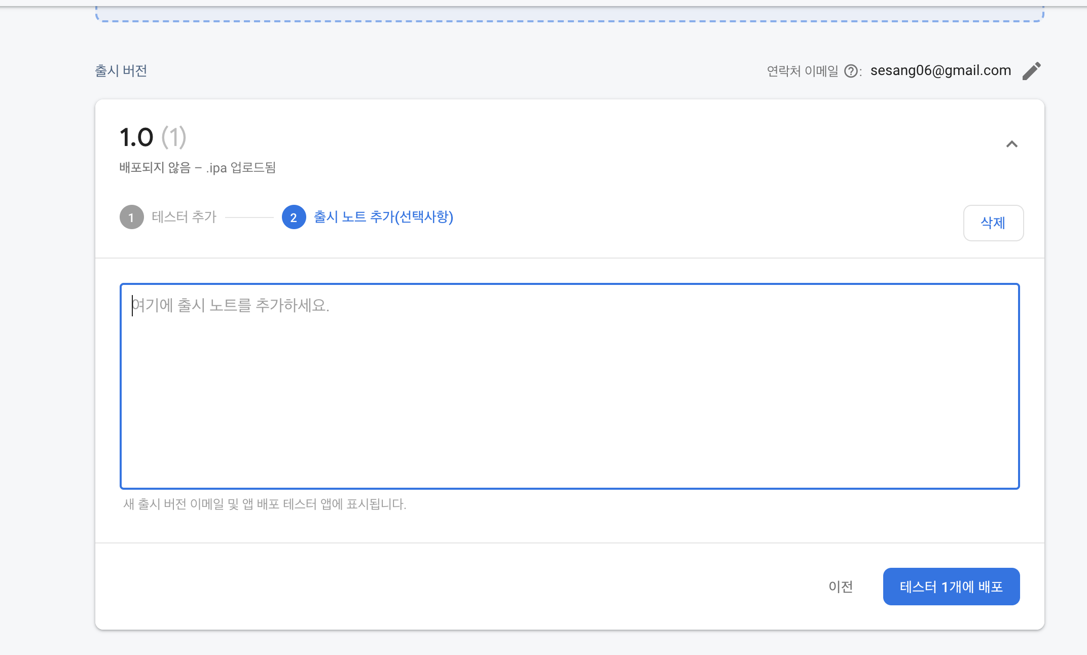 테스터에 배포할 사람들의 이메일을 입력합니다.