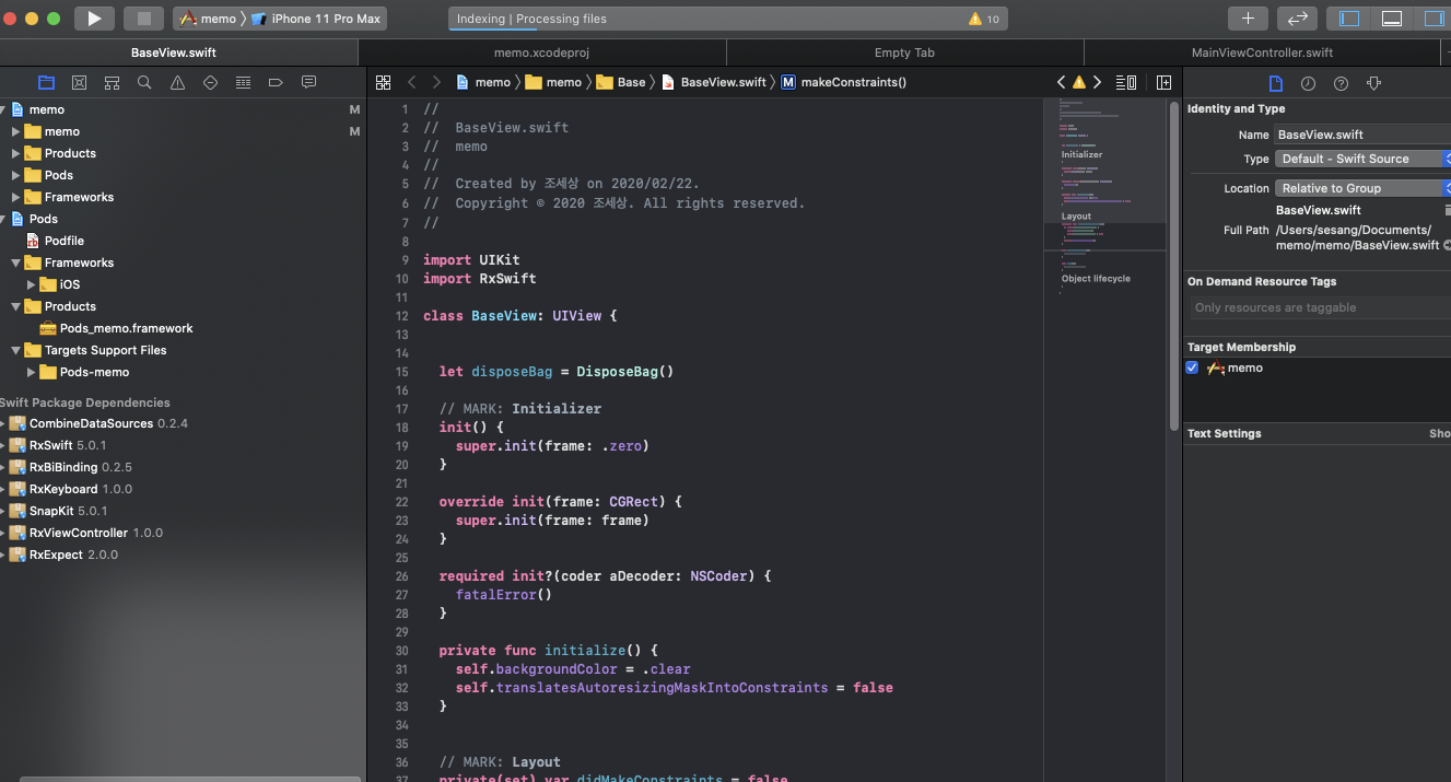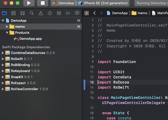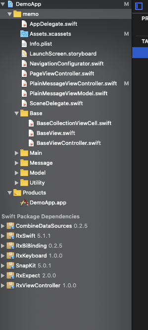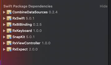 name: DemoApp packages: RxSwift: url: https://github.com/ReactiveX/RxSwift from: 5.0.1 RxCocoa: url: https://github.com/ReactiveX/RxSwift from: 5.0.1 SnapKit: url: https://github.com/SnapKit/SnapKit from: 5.0.1 RxBiBinding: url: https://github.com/RxSwiftCommunity/RxBiBinding from: 0.2.5 CombineDataSources: url: https://github.com/CombineCommunity/CombineDataSources from: 0.2.4 RxKeyboard: url: https://github.com/RxSwiftCommunity/RxKeyboard from: 1.0.0 RxViewController: url: https://github.com/devxoul/RxViewController from: 1.0.0 RxExpect: url: https://github.com/devxoul/RxExpect from: 2.0.0 targets: DemoApp: settings: base: INFOPLIST_FILE: memo/Info.plist PRODUCT_BUNDLE_IDENTIFIER: com.myapp type: application platform: iOS deploymentTarget: 13.0 sources: [memo] dependencies: - package: RxSwift - package: RxCocoa - package: SnapKit - package: RxBiBinding - package: CombineDataSources - package: RxKeyboard - package: RxViewController새로 번잡스러운 것들이 많이 생겼습니다.